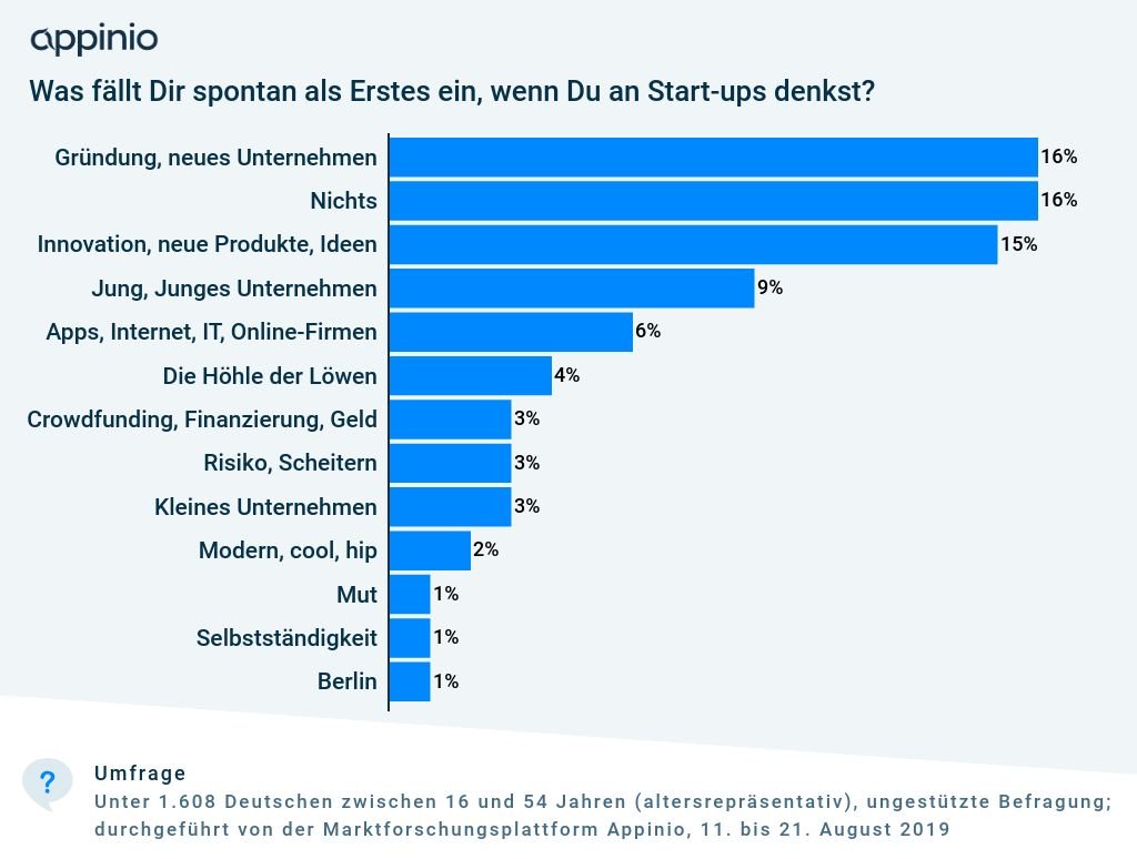 Woran denken die Deutschen, wenn sie das Wort „Start-up“ hören? Diese Frage stellte die Marktforschungplattform Appinio 1.608 digitalaffinen Menschen im Alter von 16 bis 54 Jahren im Rahmen einer Umfrage im August 2019. Der Clou: Die Befragung war ungestützt, die Teilnehmer erhielten keine Antwortmöglichkeiten.