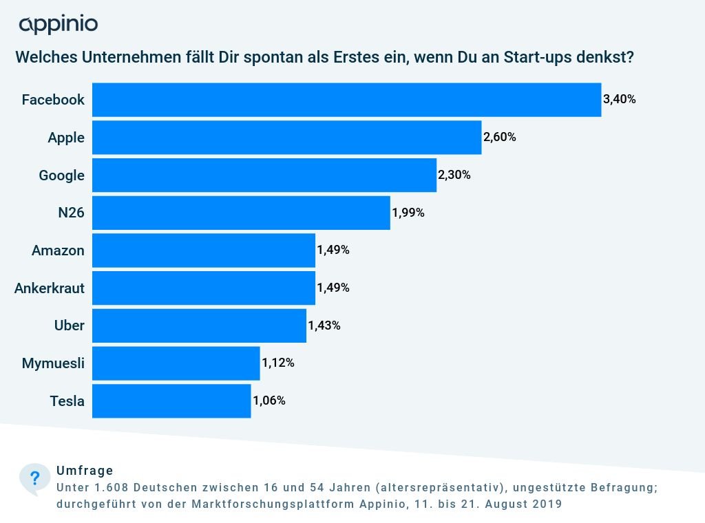 Appinio wollte zudem von den Befragten wissen, welche Unternehmen ihnen spontan einfallen, wenn sie an Start-ups denken. Auch hier wurde wieder eine offene Frage ohne Antwortmöglichkeiten gestellt. Auffällig bei den Antworten war, dass die Befragten Start-ups stark mit Technologie-Unternehmen assoziieren. Ganz vorn lagen die US-Riesen, die schon lange keine Neugründungen mehr sind: 3,4 Prozent der Befragten dachten spontan an Facebook, 2,6 Prozent an Apple. Google landet auf Platz drei mit 2,3 Prozent. Knapp 2 Prozent nannten die deutsche Digitalbank N26. Danach folgen Amazon und das norddeutsche Gewürz-Start-up Ankerkraut mit jeweils rund 1,5 Prozent. Zu weiteren Unternehmensnennungen im 1-Prozent-Bereich gehören außerdem Uber, Mymuesli und Tesla.