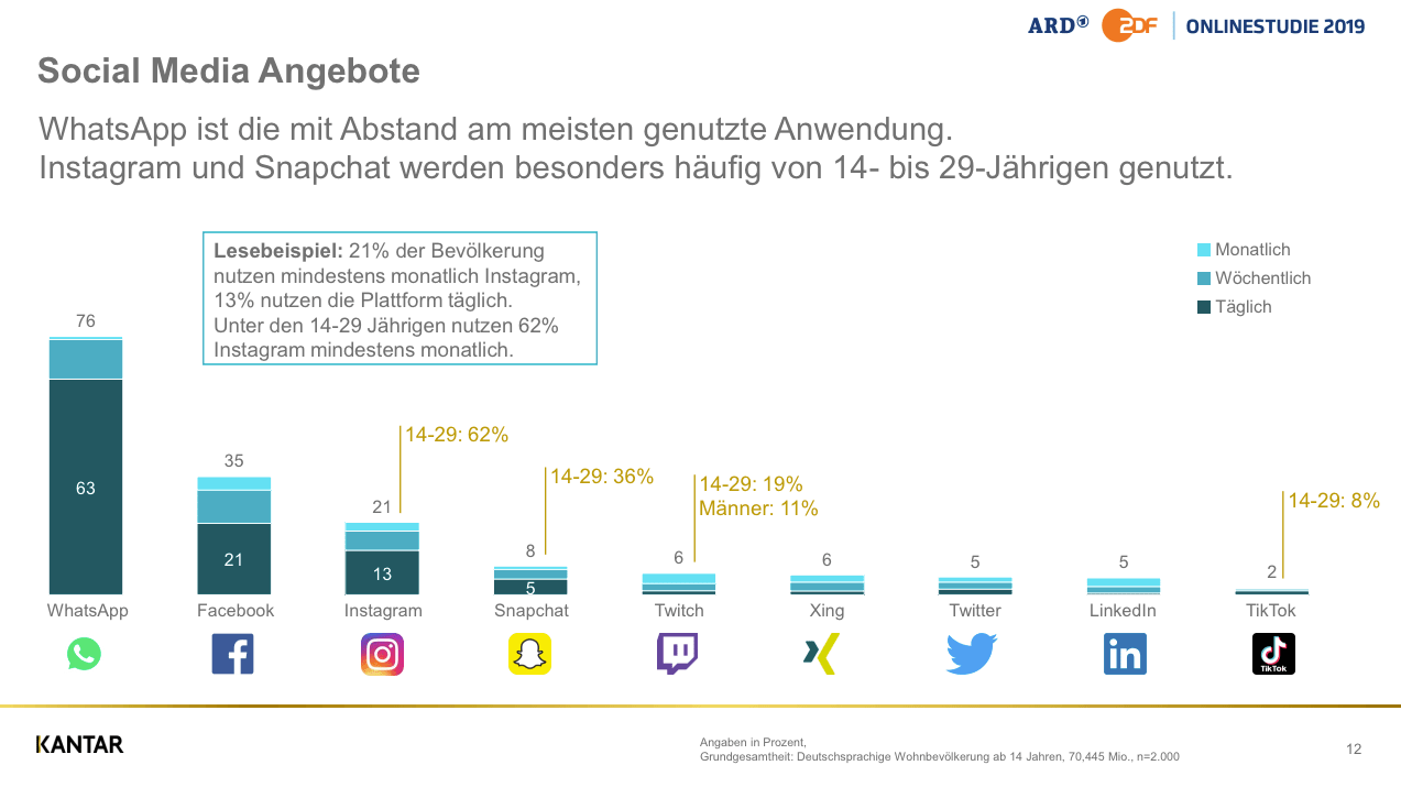 Facebook? Twitter? Oder doch eher Instagram, WhatsApp und TikTok? Welche Social-Media-Kanäle werden in Deutschland am häufigsten genutzt? Die ARD/ZDF Onlinestudie 2019 liefert Antworten und offenbart zudem spannende Insights zur Nutzung von Sprachassistenten und Streaming-Portalen.